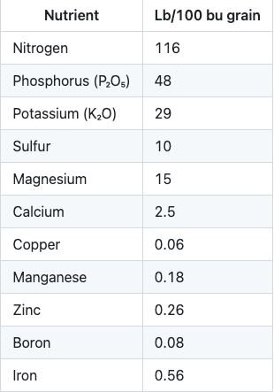 Winter cereals require adequate and balanced fertility to maximize yield. The following chart, courtesy of AgPhD.com, shows the nutrients needed to produce 100 bushel of winter wheat.1