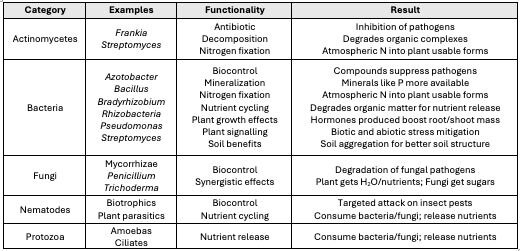 A systematic review of a “Soils 101” textbook or a quick internet dive goes a long way in establishing which beneficial microbes are the most common, and what they contribute. The following chart summarizes these findings: