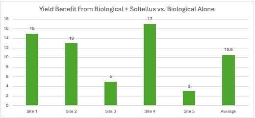 In 2024, a series of five trials was conducted in SW Minnesota using Soltellus™ in tandem with a biological crop nutrition product and compared to the biological product alone. Soltellus™ boosted yield in 100% of the trials by an average of 10.6 bu/A over the biological product by itself.